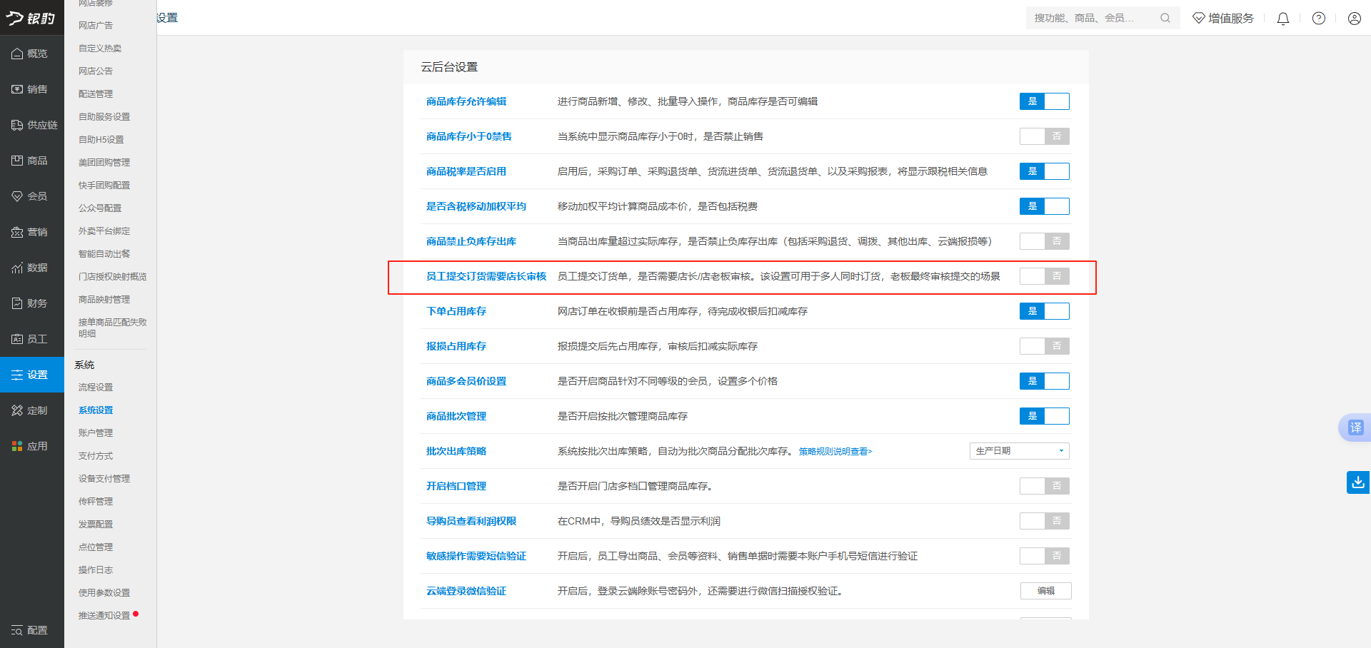 总部账号云后台--【设置】--【连锁管理】,关闭/开启【商品可用库存不足禁订】。开启则当配货仓库(不是所有仓库)商品可用库存小于订货量,禁止下订货单,如要开启商品可用库存不足禁订,一般会配合开启【显示商品的可用库存】一起使用。