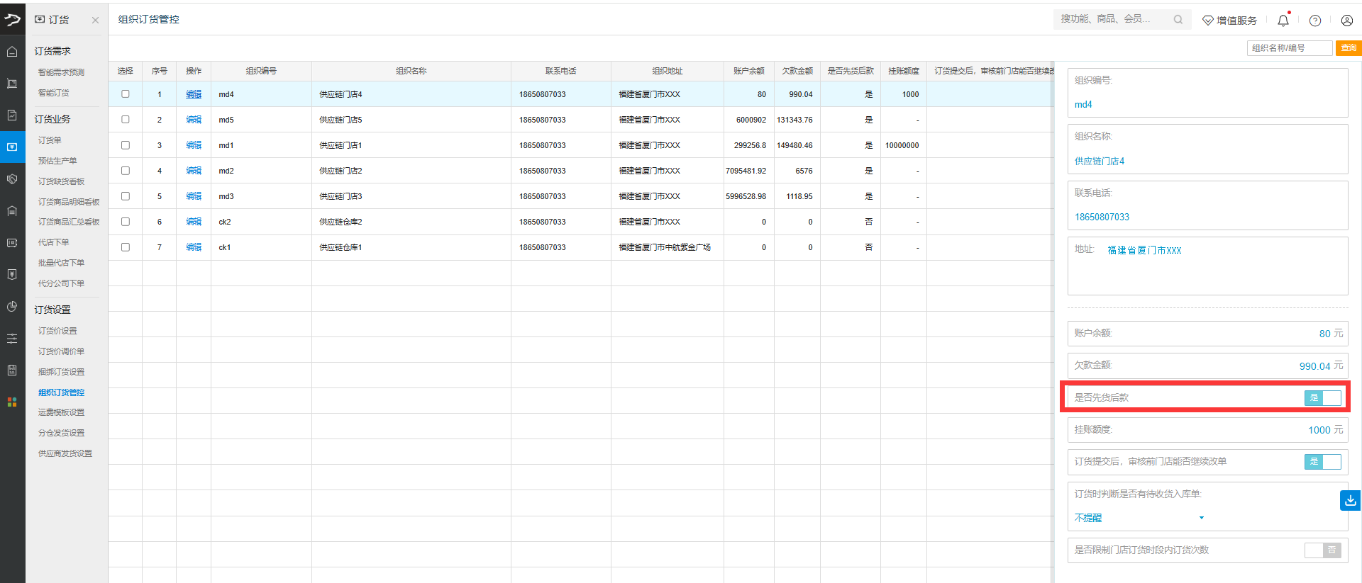 A:可以的,总部后台供应链板块中,【订货】-【组织订货管控】,找到需要限制的门店,点击【编辑】,关闭【先货后款】功能,若不允许赊账,可以将挂账额度设置为0即可。