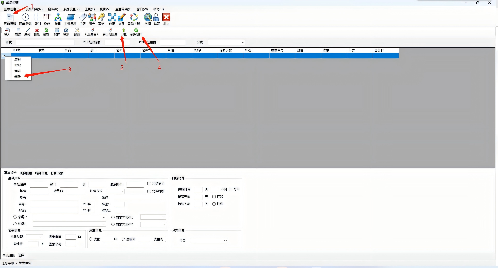 2、点击商品编辑,点击上载,然后选择全部PLU商品后在列头右键选择删除,然后重新发送到秤。