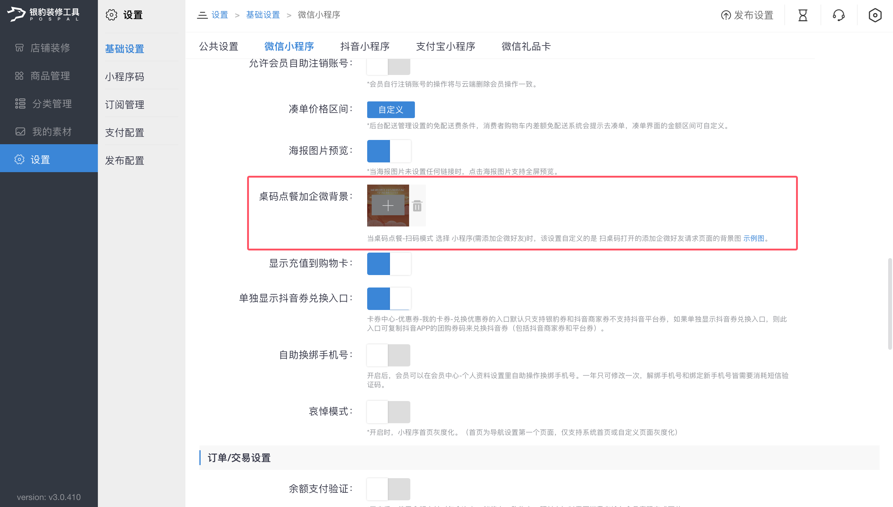 如需自定义扫码添加企微好友页面的背景图,可登录银豹装修后台,进入「设置 - 基础设置 - 微信小程序」页面,在常规设置下找到【桌码点餐加企微背景】设置项,点击上传图片即可完成自定义。